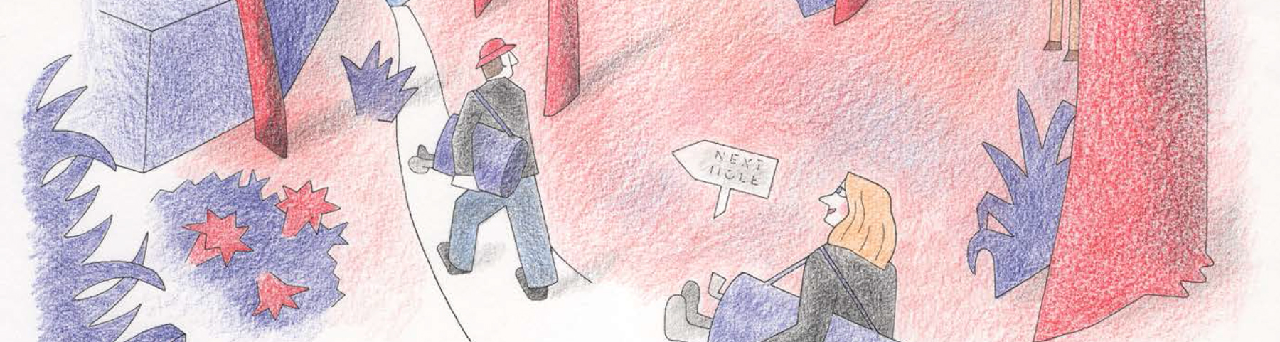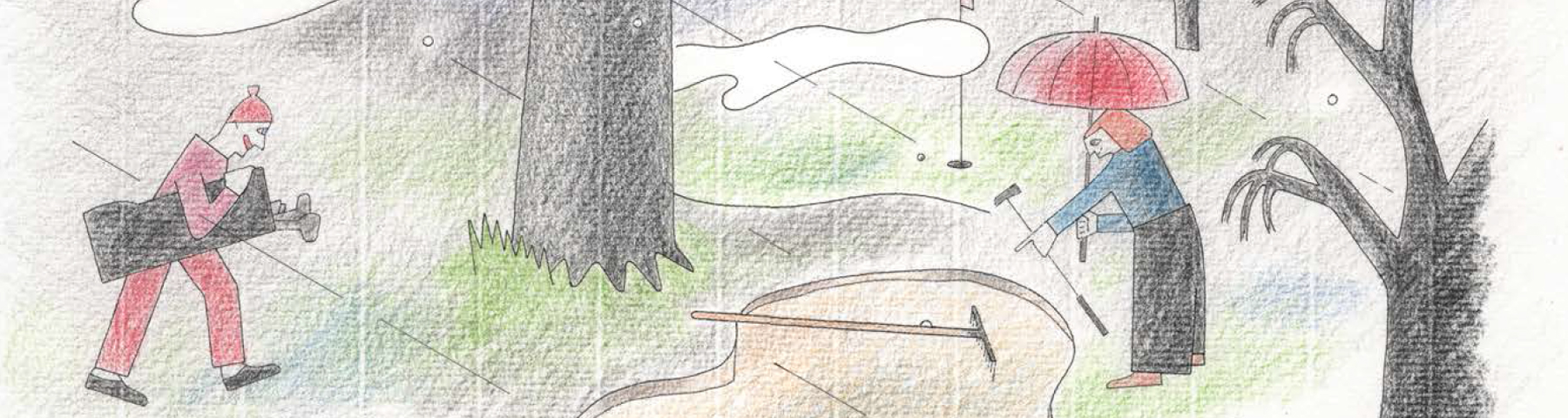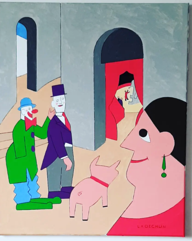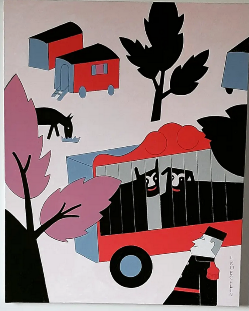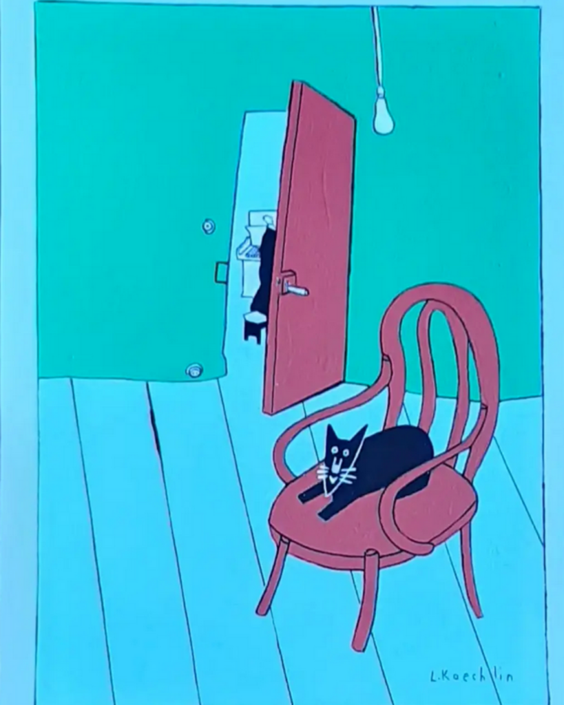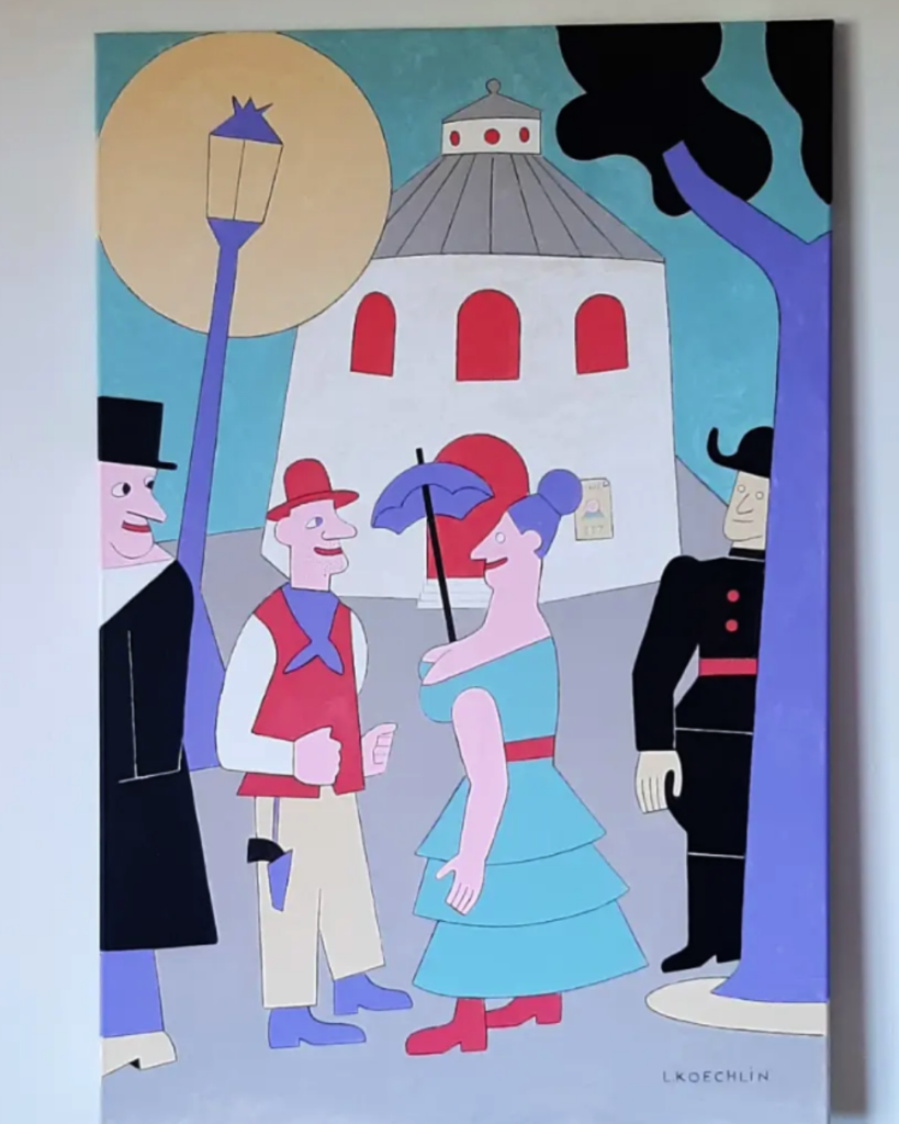 Avec ce trait unique, d’une évidente simplicité et cette palette franche de bleus et de rose tendres, de jaunes solaires et de verts pistache, Lionel Koechlin dessine un univers identifiable au premier coup d’œil, entre enchantement féerique et étrangeté poétique.