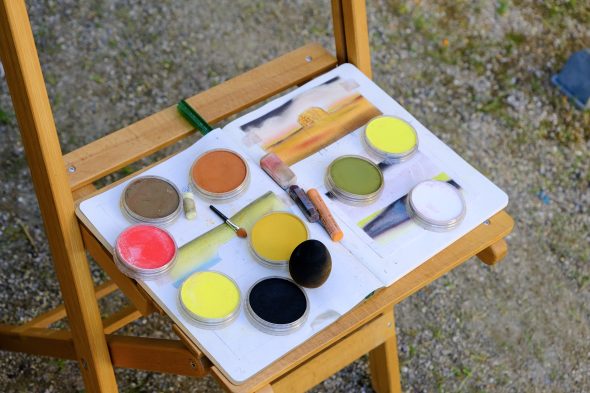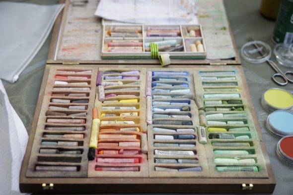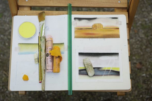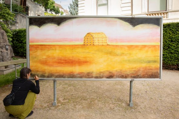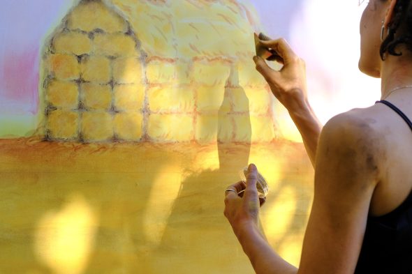 Le 24 mai dernier, le festival PictoBello, à Vevey, en Suisse, conviait vingt dessinatrice.eur.s pour une journée de dessin sur le thème « Toit et moi ». Dans une fresque grand format, sur un panneau habituellement réservé à la publicité, Lisa Mouchet rendait alors hommage aux horizons infinis du Berry, dans cette fresque au pastel sec « Château de paille ».