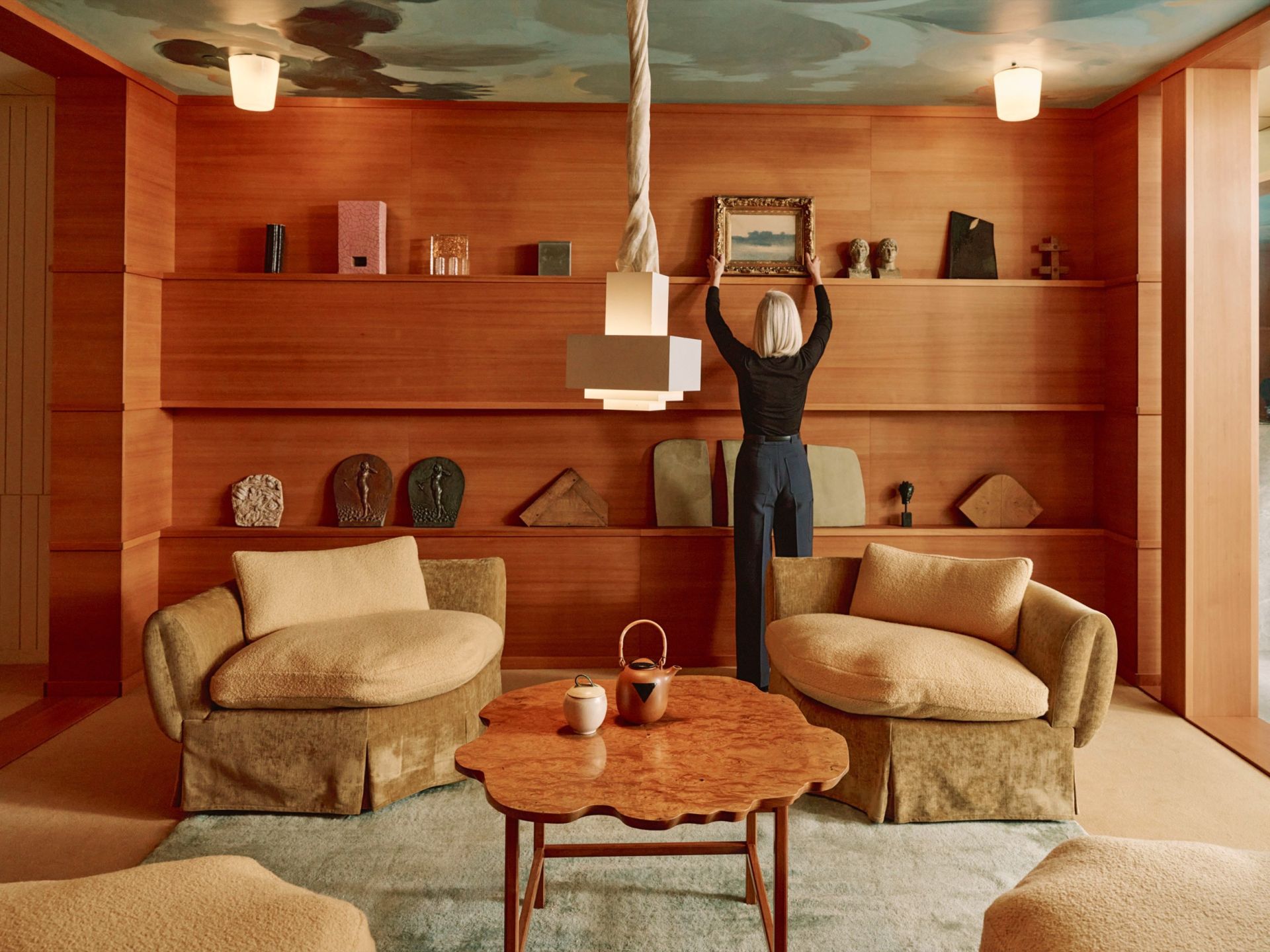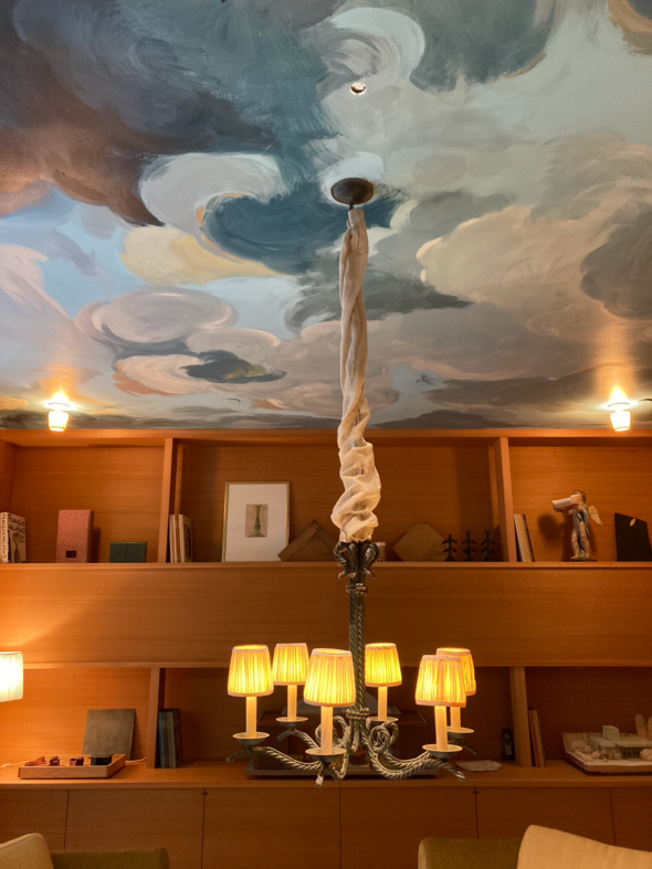 Marion Kadi a peint un ciel nuageux pour l’une des pièces, ainsi que les invitations, prolongeant l’univers du lieu à travers une approche sensible du design, de la peinture et de l’objet imprimé.