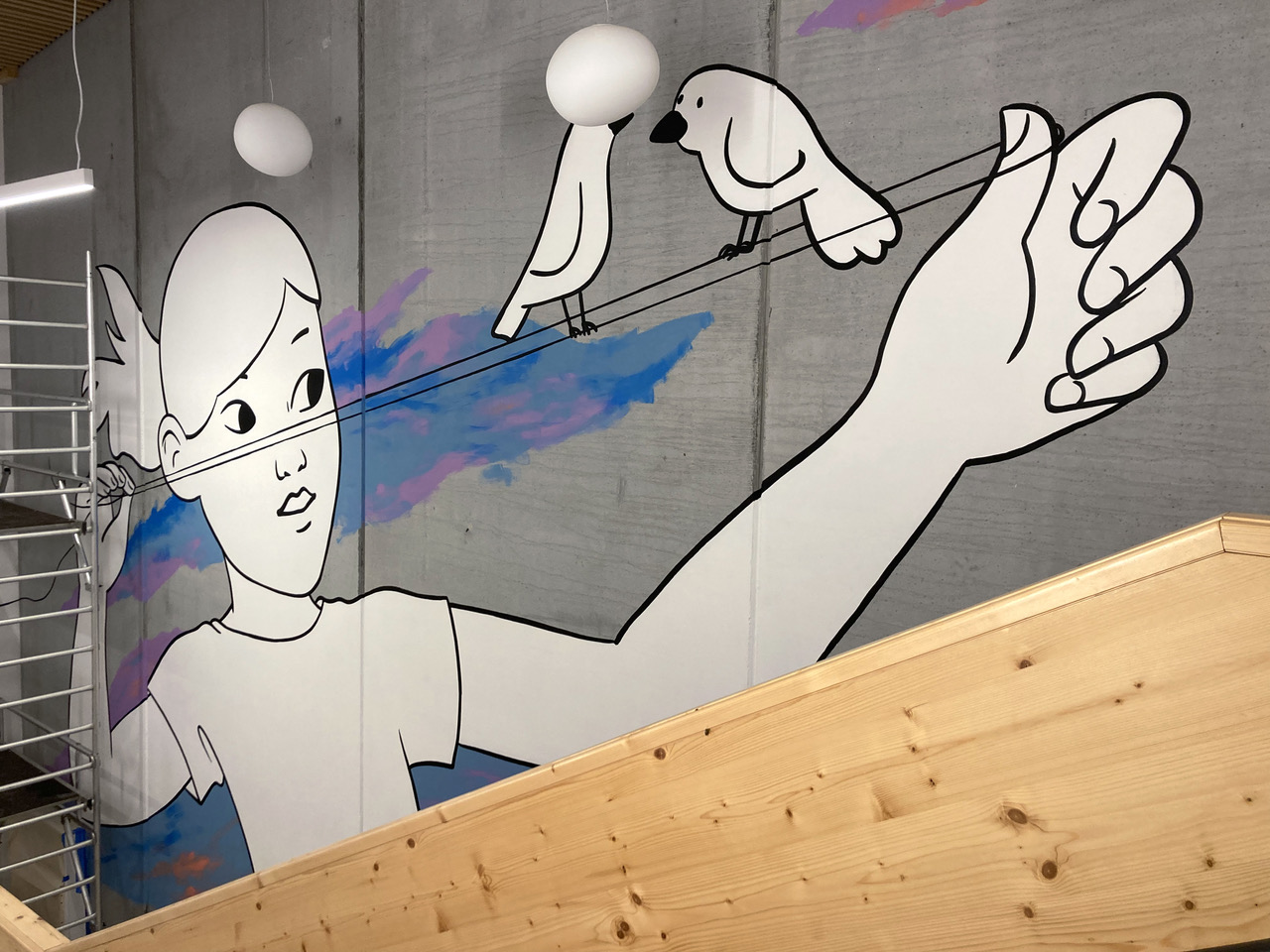Les enfants ont ensuite voté pour leur illustration préférée. Ils peuvent désormais gravir l’imposant escalier sous le regard tendre de cette petite fille aux oiseaux…